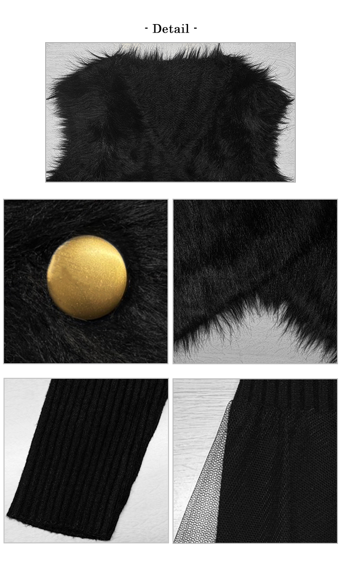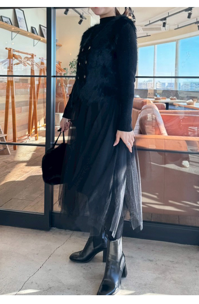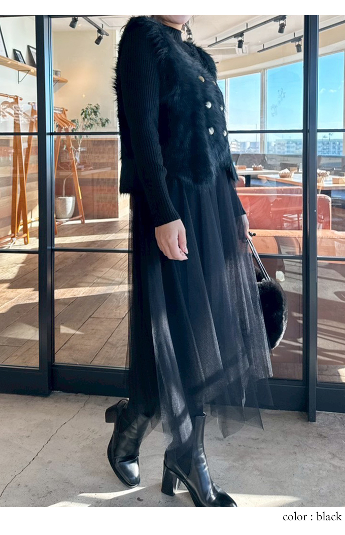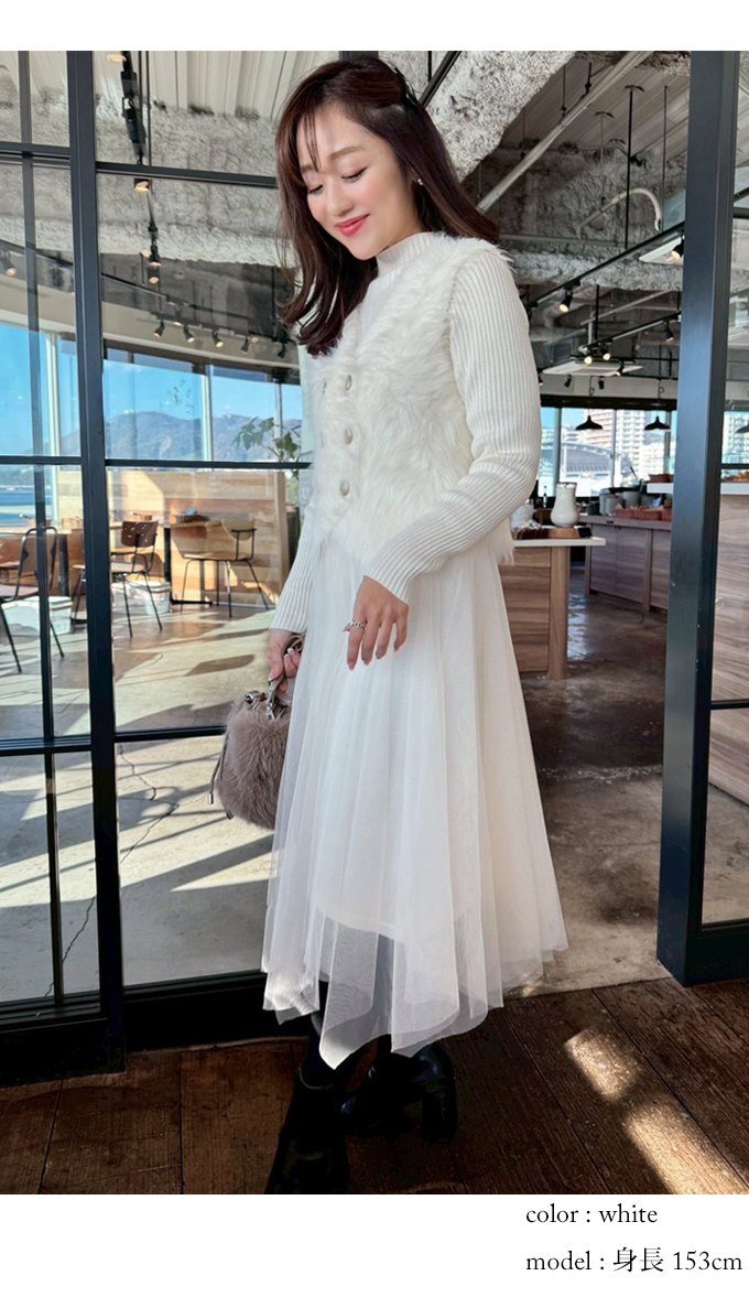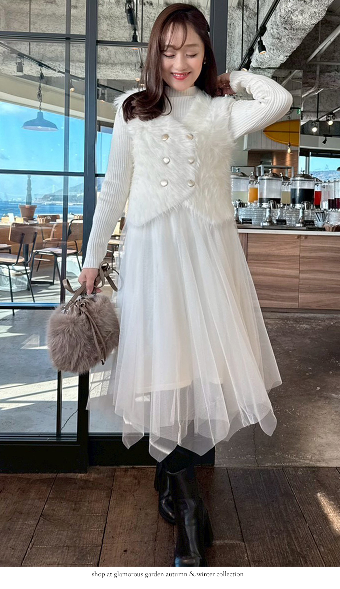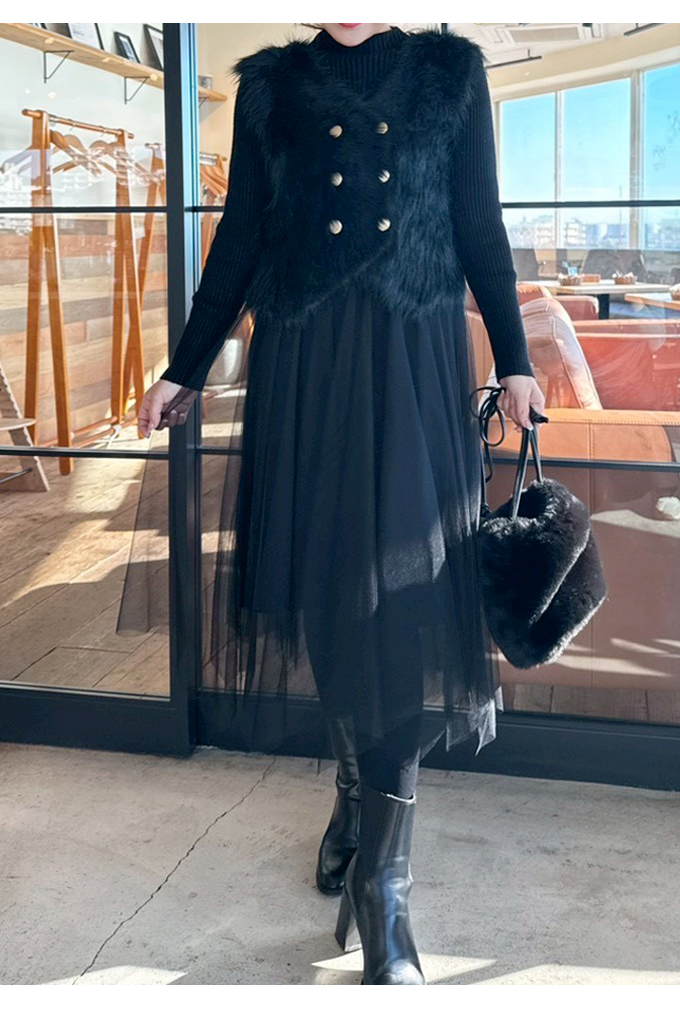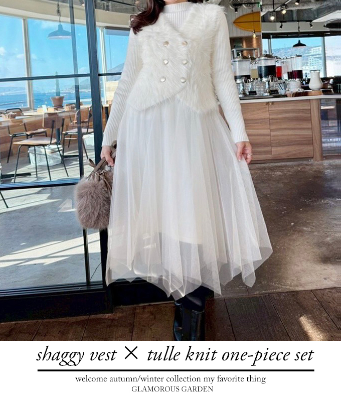 シャギーベスト×チュールニットワンピースセット【7f-831-06038】