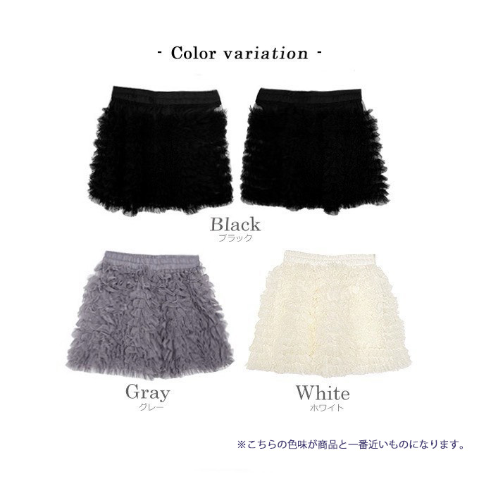 ウエスト(ゴム):約64cm、ヒップ:約122.4cm(チュール部分含む)、総丈:約46.5cm(チュール部分含む)