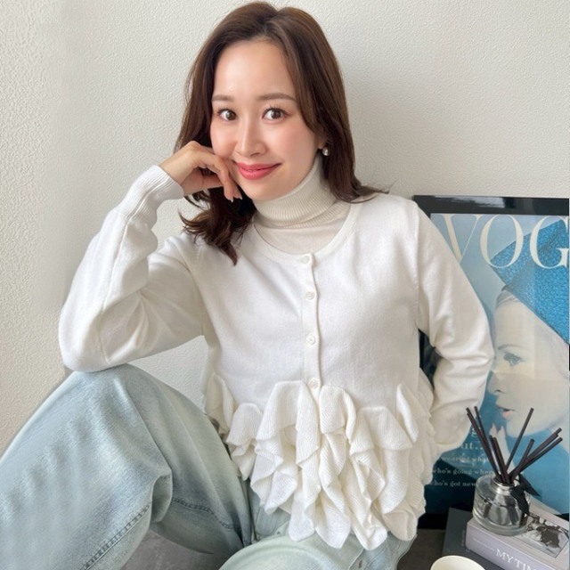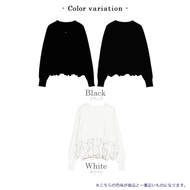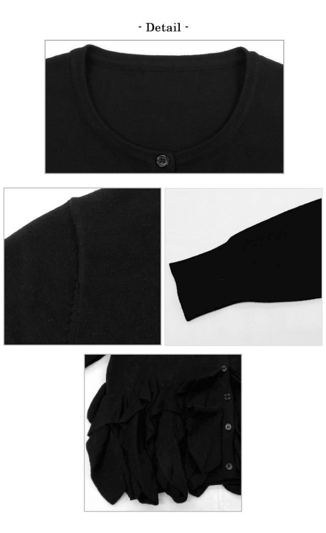| 【表記サイズ】 F (フリー) 肩幅:約36.5cm バスト:約95cm 袖丈:約60cm 着丈(フリル含む):約55cm ※平置き採寸の為若干のブレがございます。 |
