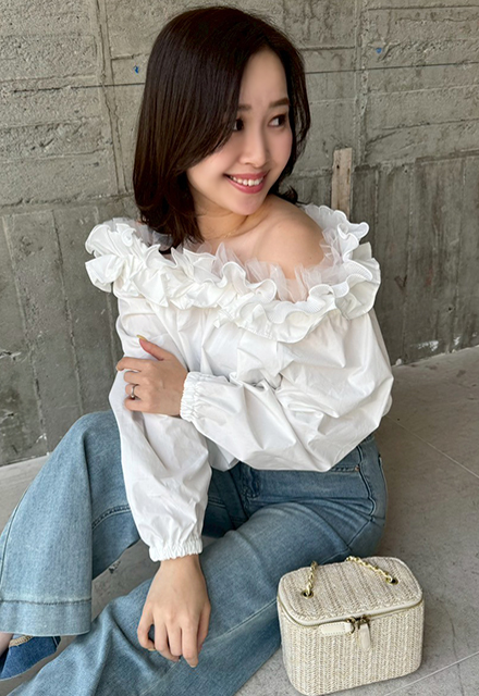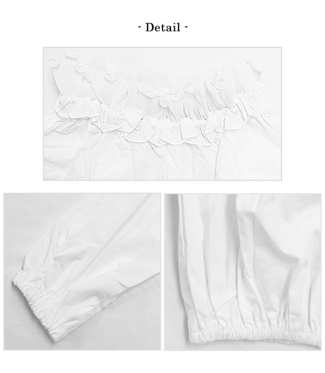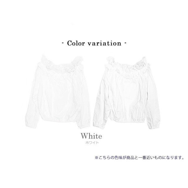 | 【表記サイズ】 F (フリー) 肩幅:約37cm(フリル部分含む) バスト:約91cm 袖丈:約55cm 着丈:約54cm (フリル部分含む) ※平置き採寸の為若干のブレがございます。 |