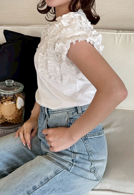 | 【表記サイズ】 F (フリー) 肩幅:約29.5cm バスト:約88cm 袖丈:約12cm 着丈:約56.5cm ※平置き採寸の為若干のブレがございます。 |