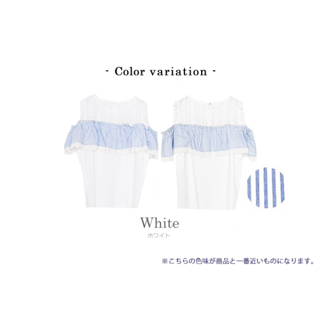 | 【表記サイズ】 F (フリー) 肩幅:約32cm バスト:約100cm フリル:約15cm 着丈:約61cm ※平置き採寸の為若干のブレがございます。 |